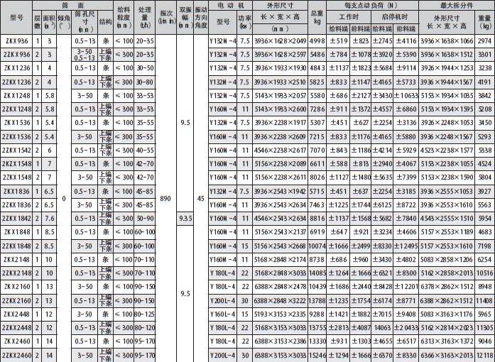 | 篩機型號 | 振動器 | 尺寸代號 | ||||||||||||||||||||||